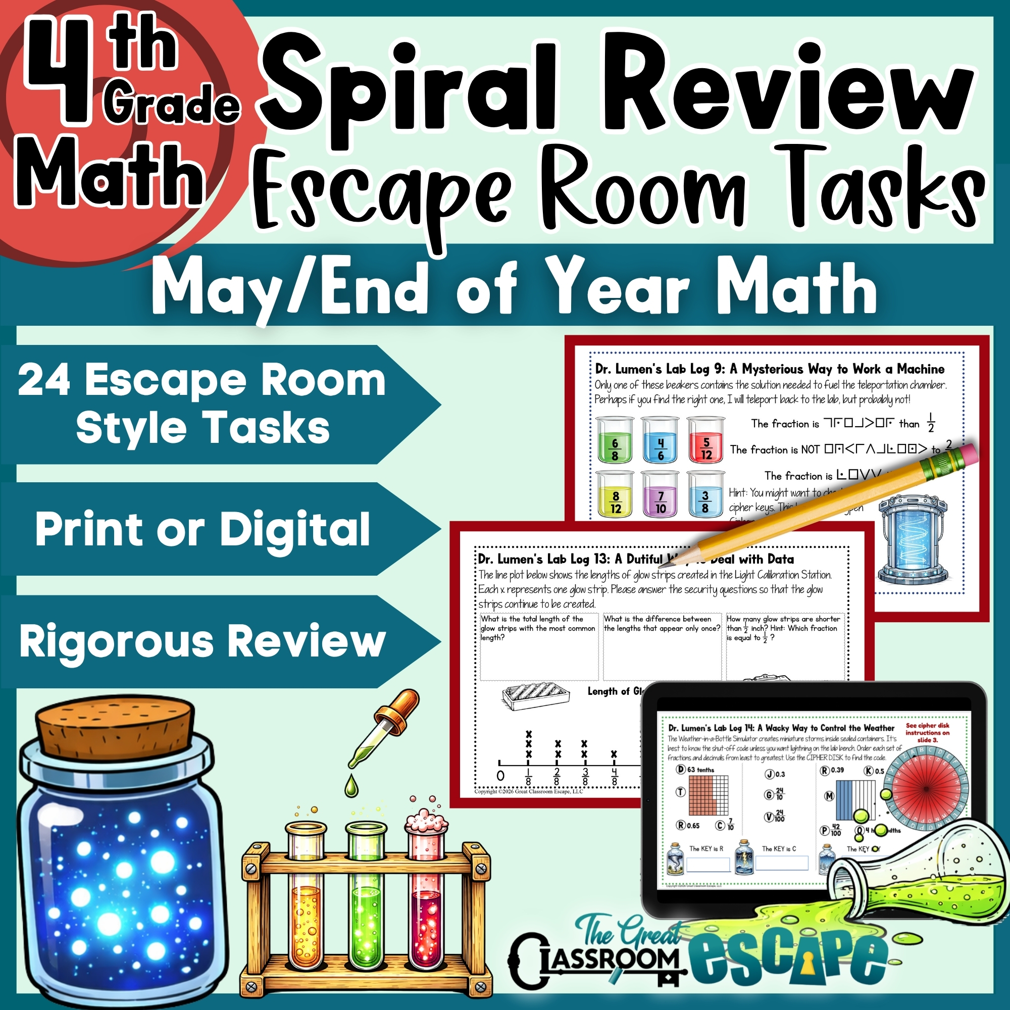 This 4th grade math escape room is a fun and rigorous way to tackle end of year test prep, spiral review, and morning work in May or June. With engaging puzzles, codes, and logic challenges, students review key 4th grade math skills while working through an exciting lab-themed escape room adventure. Perfect for 4th grade math review, test prep, math centers, early finishers, and rising 5th grade review.