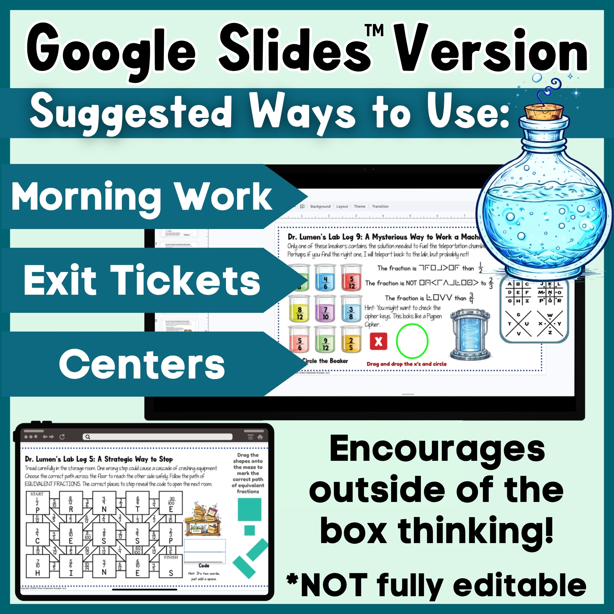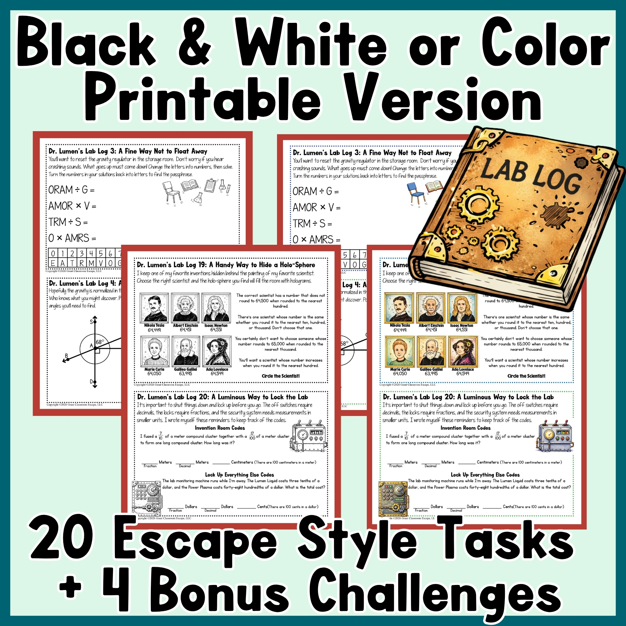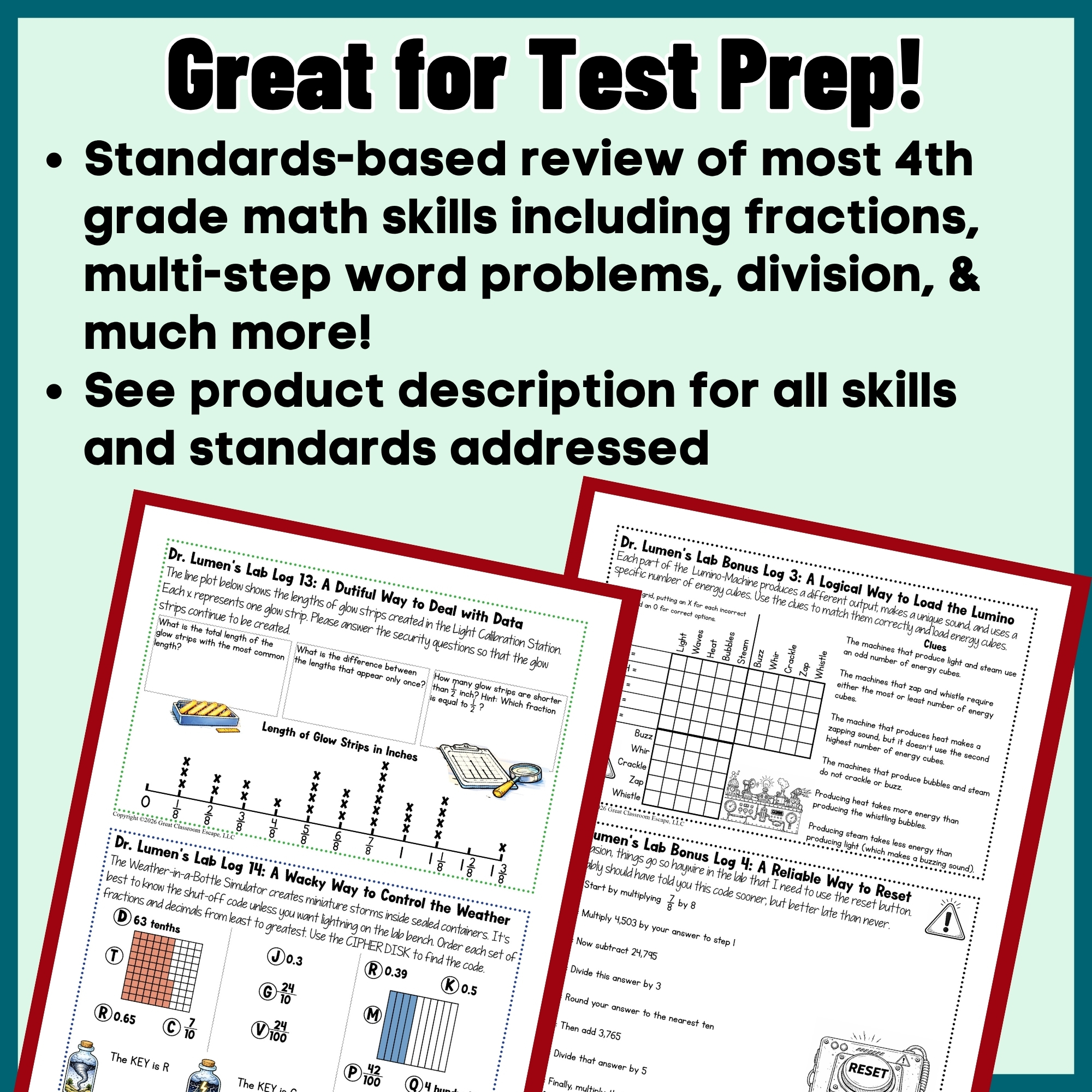 In this themed set, students must help keep Dr. Lumen’s Lab running smoothly. Each day brings a new escape room style math puzzle as students unlock doors, crack codes, solve passwords, and figure out clues to operate the lab’s unusual machines. The puzzles blend 4th grade math review with logic, reasoning, and problem solving so students stay engaged while preparing for end of year testing.