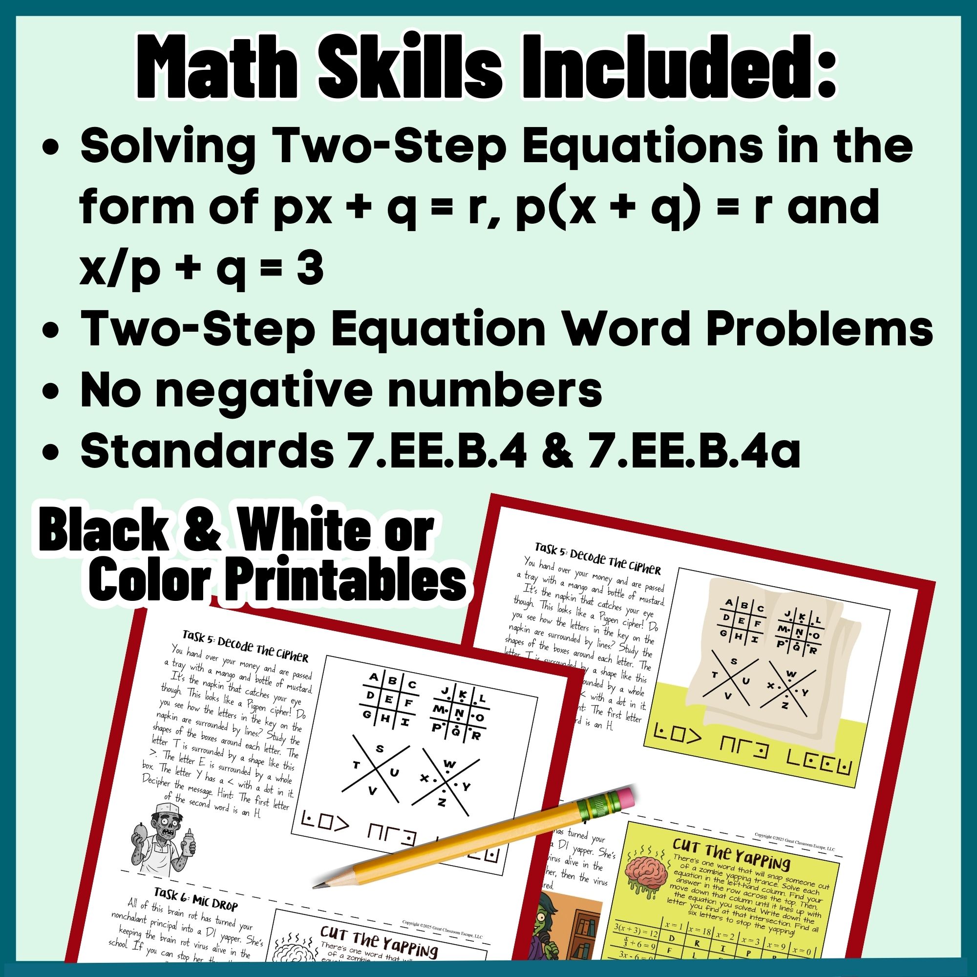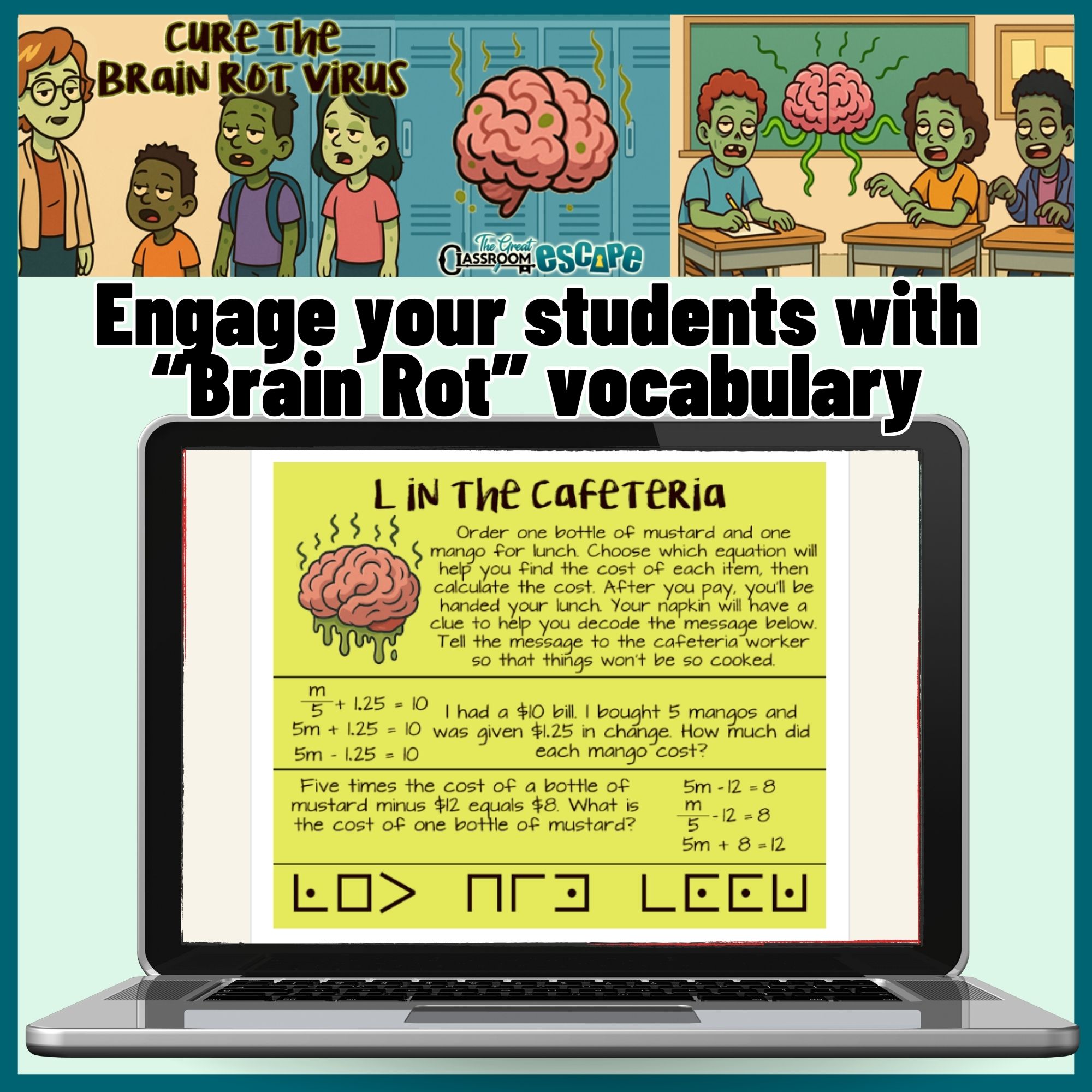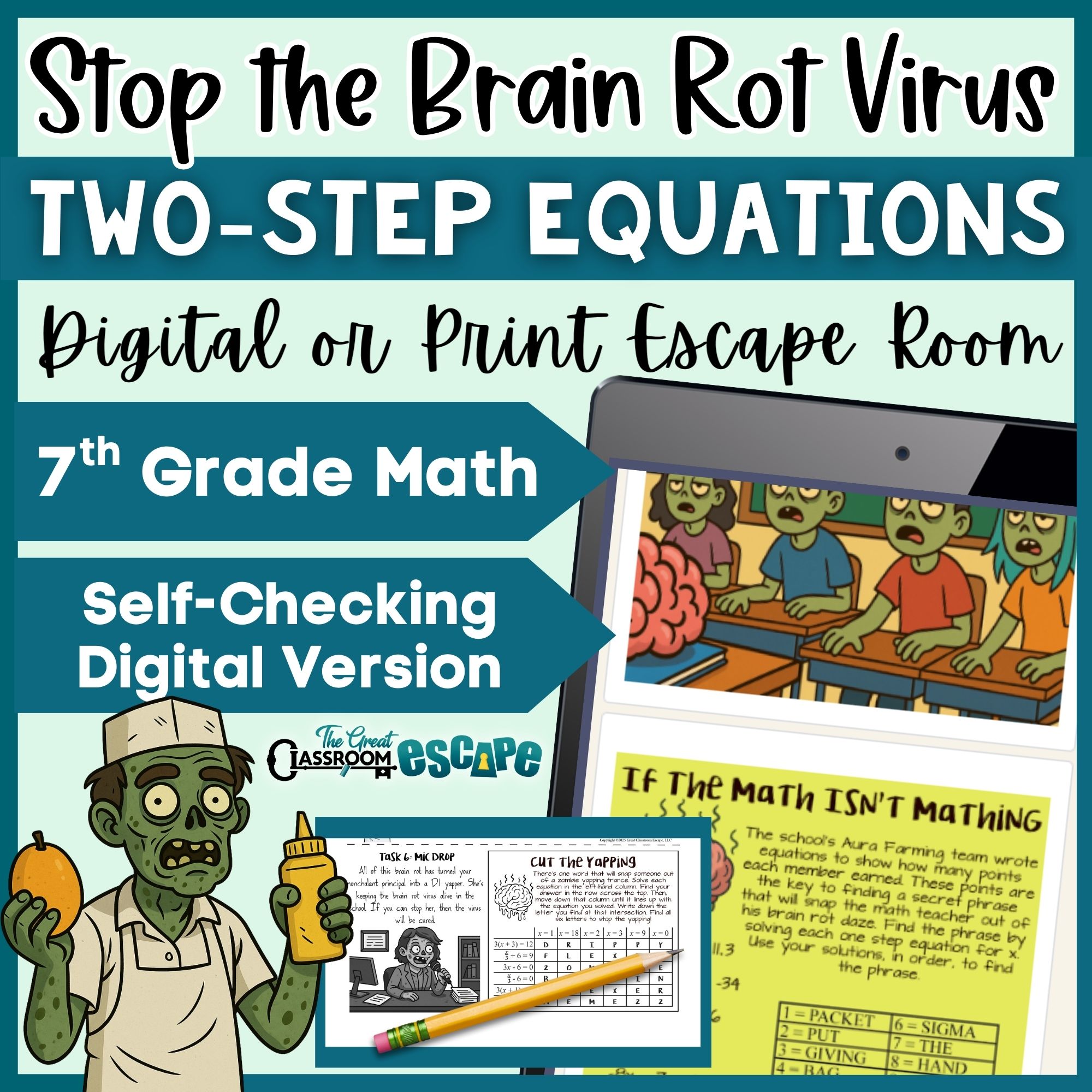 Lock in teachers! Get your 7th grade or pre-algebra students excited about solving two-step equations with this brain rot themed escape room activity. Gain aura with your middle schoolers this back to school season while giving them a fun and engaging way to practice standards-based math skills. This digital or printable escape room incorporates appropriate “Brain Rot” slang familiar to Gen Z and Gen Alpha students. A brain rot virus has overtaken the school, turning everyone into meme obsessed zombies. The teachers are using cringy slang and the students are crashing out! Can your students use their knowledge of solving two-step linear equations in one variable to stop the brain rot virus before its effects become permanent?